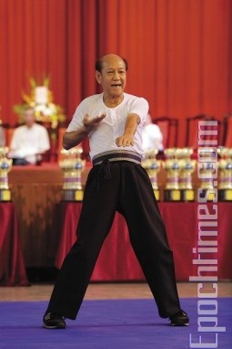 在海外教授中西方學生的盧文錦,今天為新唐人武術大賽表演詠春拳第一套拳法,該拳法共108個動作,一招一式充滿勁力,雖然招式緩慢,將內力傳達到每個動作當中,兼具養生和應敵的效果。