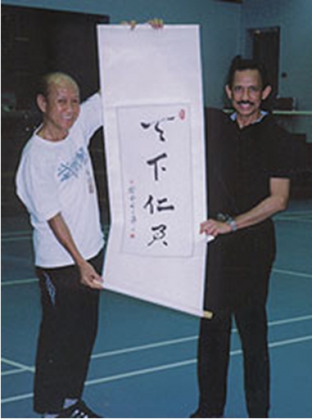 The Sultan himself was in England and unfortunately was not able to meet him that time, but the opportunity arrived in July 2006, when Sifu Lo was invited to the Queen’s Gym, where he presented his book “Police Kung Fu” to the Sultan. After some conversation, the Sultan set up a training schedule for him to practice Wing Chun and some special moves with Sifu Lo. The next day, when the Sultan arrived for training, he also brought his bodyguard and requested that he first spar with Sifu Lo a little. Despite having anticipated that this kind of situation would happen, he realized there really was no way to avoid it. As the Chinese say, “If I don’t have the skill and the courage, I will not approach the warriors of Leung Mountain.” The bodyguard initiated and Sifu Lo countered with Wing Chun techniques, unequivocally striking him, then changed techniques to follow-up, rolling his body out of range, and returning to a fighting stance. When the man’s next move came, Sifu Lo applied more Wing Chun fighting theories: attacking to defend; covering and controlling; and giving and taking by use of the opponent’s power until finishing the fight with the famous chain-punch and chase once the man’s guard was down. The moves left a good impression, everyone saved face, and no one was hurt. The Sultan now knew and trusted Sifu Lo’s skills more and began his training under him immediately. Thus was how Sifu Lo Man Kam became the first modern kung-fu Sifu to an emperor.